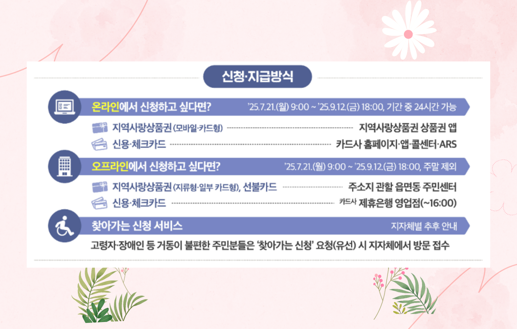 - 지역사랑상품권: 앱/카드/지류형 등 선택, 일부 지자체는 추가 포인트 지급
