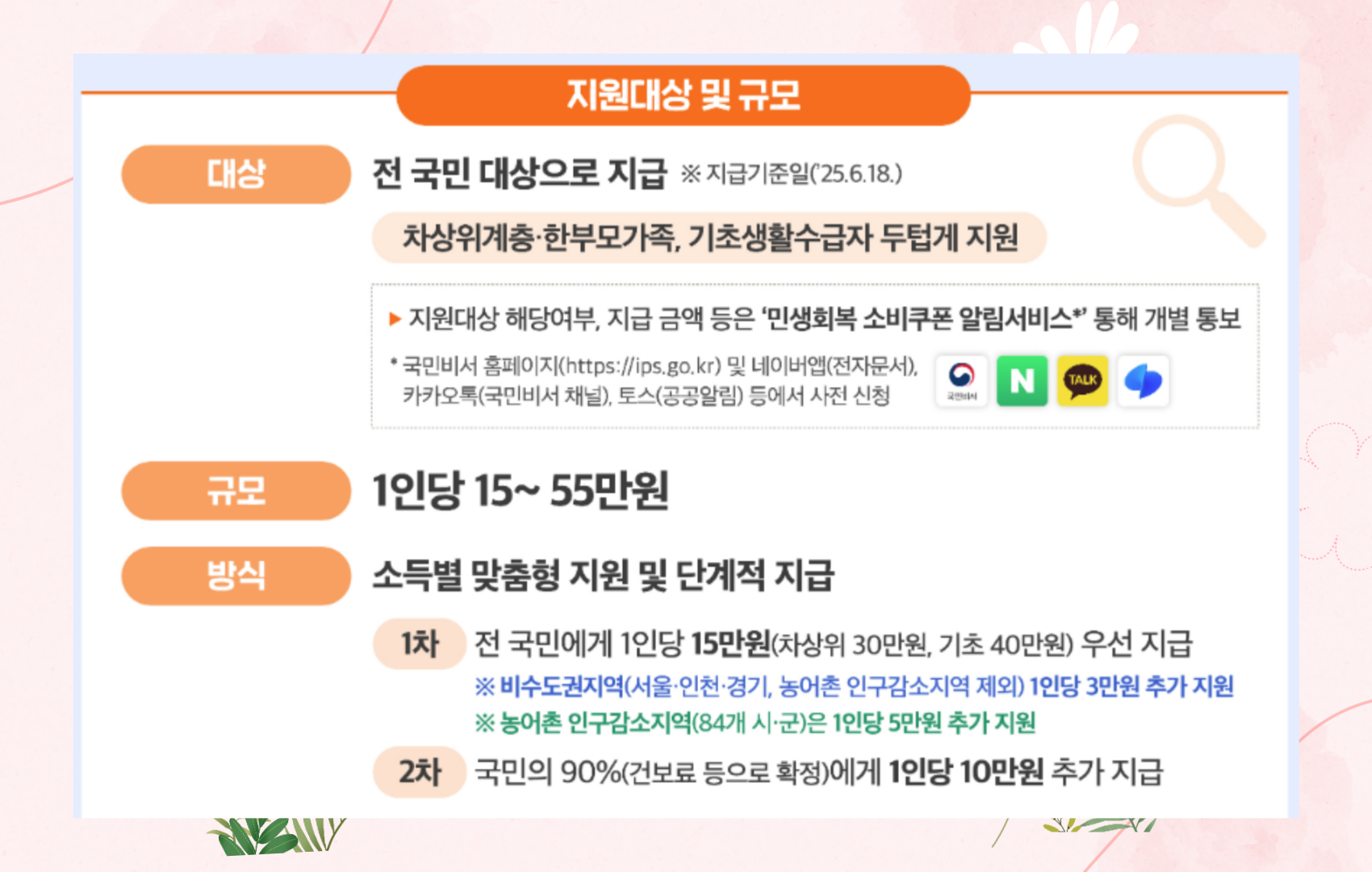 행정안전부는 2025년 7월 14일부터 카카오톡, 네이버앱, 토스 등 17개 앱과 국민비서 홈페이지를 통해 ‘소비쿠폰 알림 서비스’