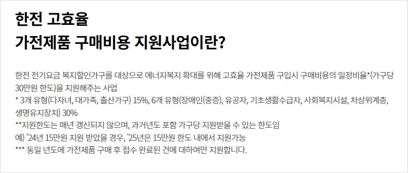 2025년에도 한전(한국전력공사)에서는 전기요금 복지할인을 받는 가구를 대상으로 고효율 가전제품을 사면 최대 30만 원까지 현금으로 돌려주는 사업을 진행하고 있어요.